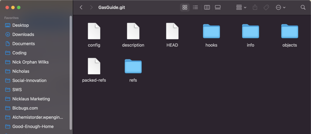 The bare repo we create won’t contain any project files. This will allow us to push only the git history from our origin project to our target project. If we take a look inside of the created folder, “GasGuide.git”, we will see only .git files: